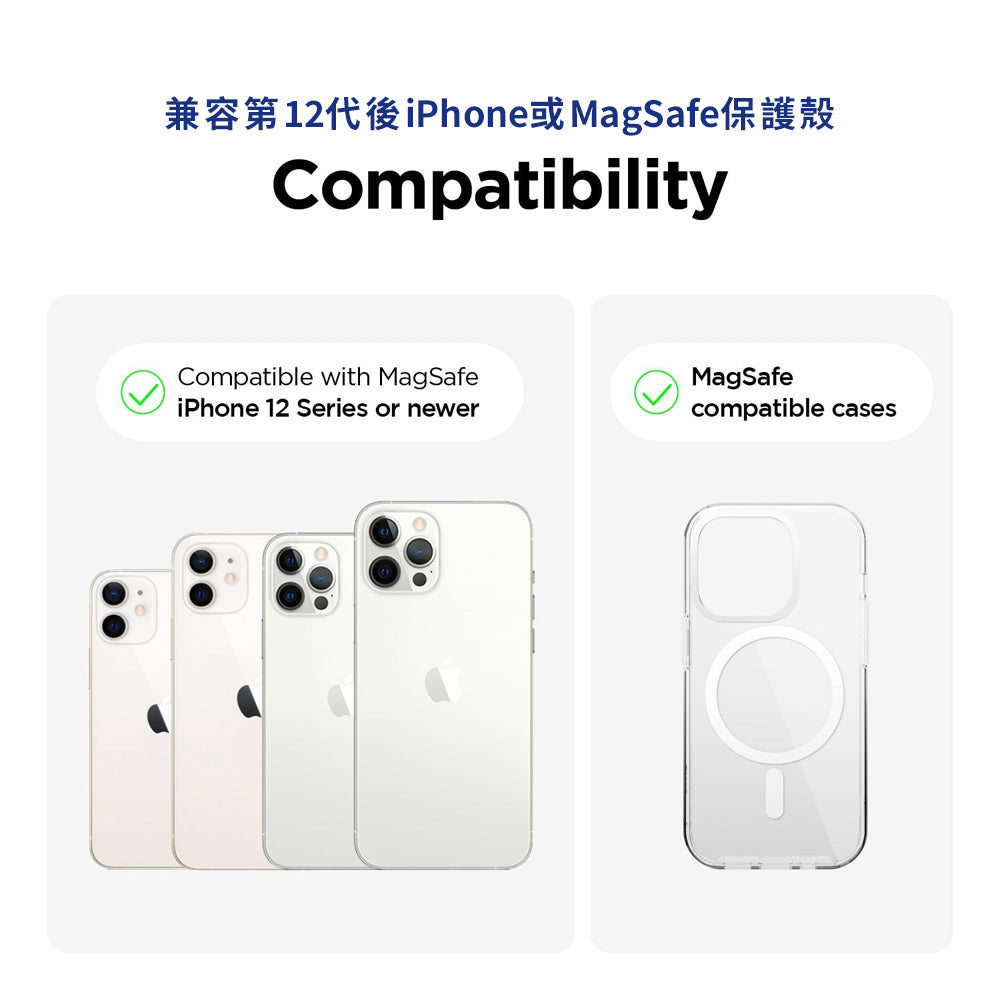 手機本身要有磁吸功能(iPhone 12(含)以後)或是保護殼具MagSafe磁吸功能才能適用。若手機有使用保護殼本身沒有MagSafe磁吸則不建議使用。